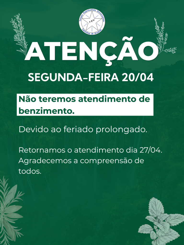 O benzimento é uma prática espiritual tradicional de cura e proteção energética. No TEU, realizamos benzimentos utilizando ervas e orações, promovendo equilíbrio e bem-estar espiritual.