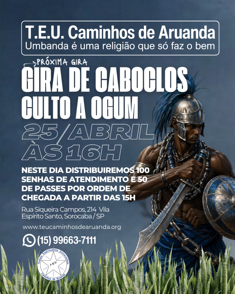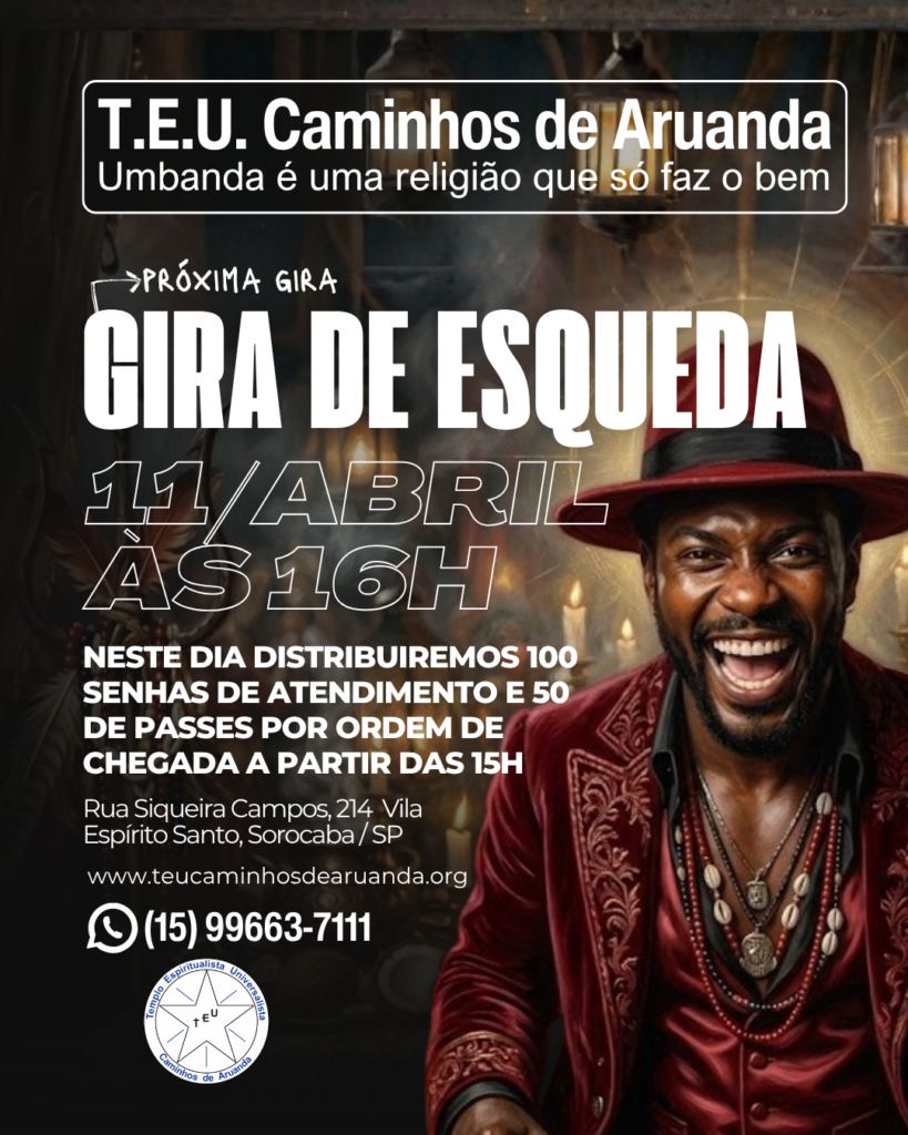 Participe de nossas giras espirituais e vivencie a energia dos Orixás e entidades de luz. Um momento de fé, aprendizado e conexão espiritual.